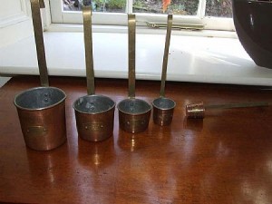 Five Brass Hanging Kitchen Measures with brass handles, estimate 60-90 euro.
