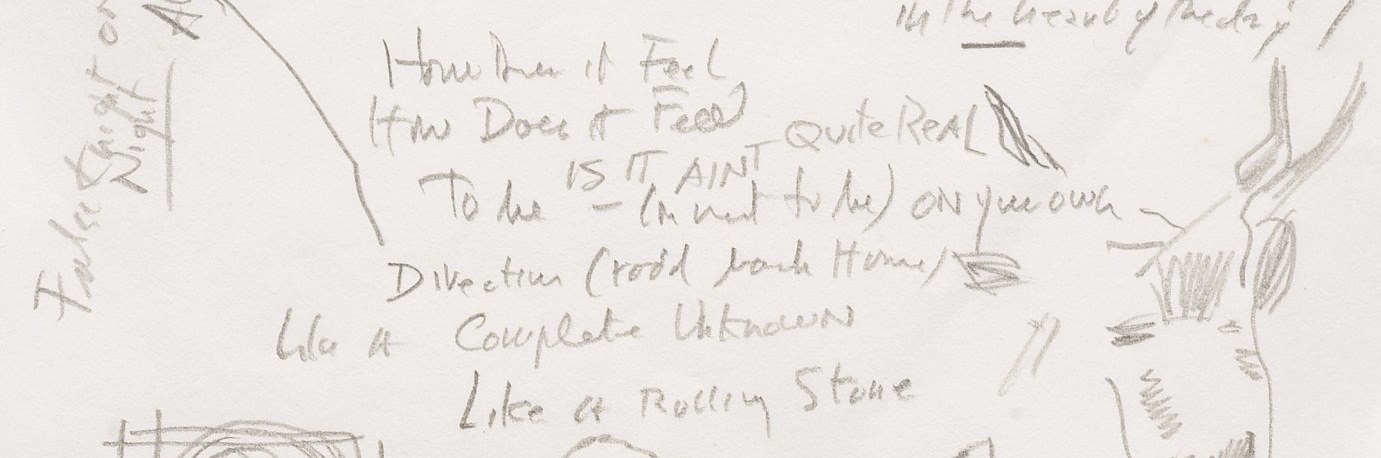 Bob Dylan’s original handwritten lyrics for the 1965 epic Like a Rolling Stone will lead Sotheby’s inaugural rock and roll history sale in New York on June 24. Since ushering in a new musical era inthe 1960’s Like a Rolling Stone has remained enduringly popular and topped Rolling Stone Magazine’s list of 500 Greatest Songs of All Time. The song transformed Dylan from a folk singer into a rock icon. The near complete four page working draft is estimated at $1-2 million.