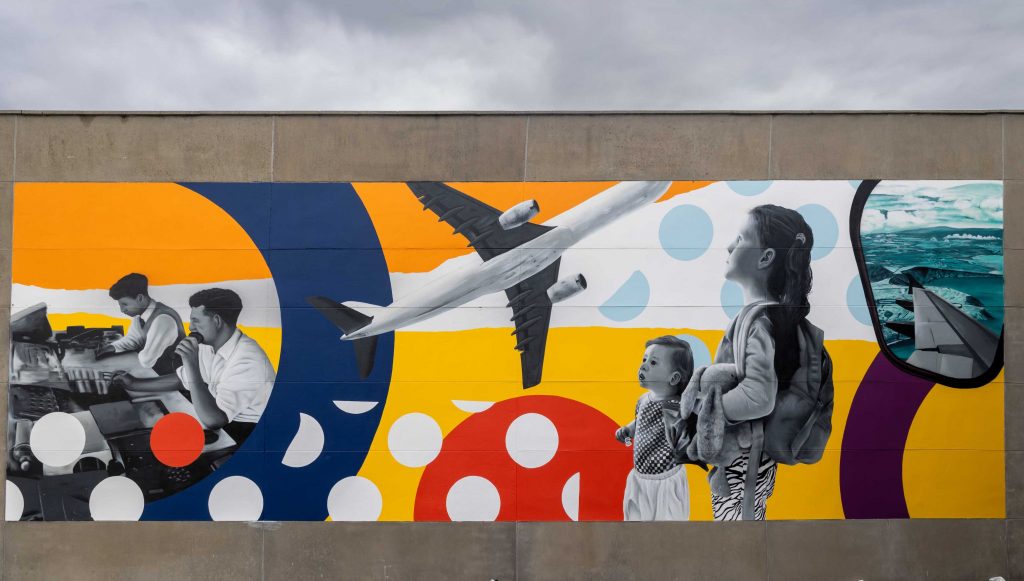 The new Cork Airport Mural by Shane O’Driscoll and Peter Martin is the latest project by Ardú Street Art, the open-air gallery which has been working in Cork city since 2020. This years projects will bring more colour and creativity to the streets of the city. The Wonder of Travel at Cork Airport is the first of three projects in 2025. It celebrates the history of air travel through Cork Airport since 1961 while looking forward to a bright future and further development. The creation of two new large scale murals in the city centre is now underway. With deep roots in graffiti culture the multidisciplinary artist Kone.one is working at Water Street in the city centre. The other by Jo Hicks (aka Hixxy) is located at Liberty St. Ardu is supported by Creative Ireland, Cork City Council Arts Office, Pat McDonnell Paints, and Cork Airport.