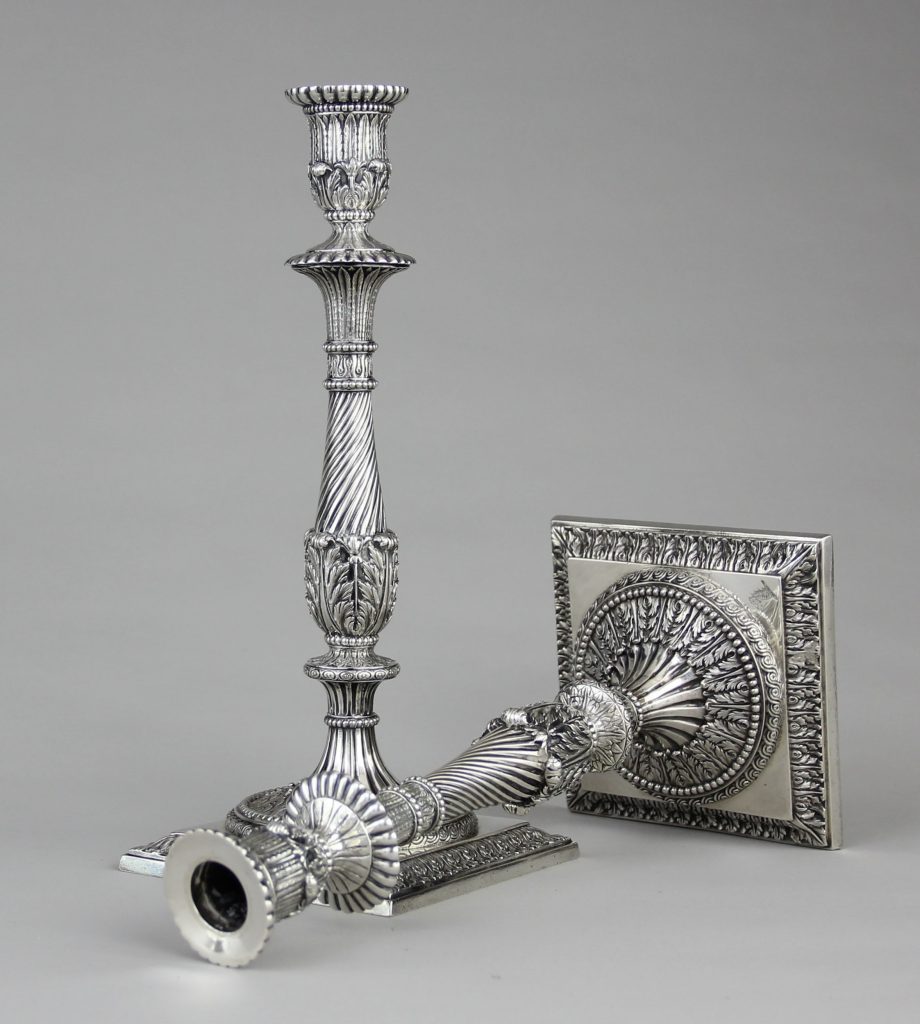 This pair of c1770 cast, chased and engraved Dublin George III candlesticks by the Dublin maker Richard Williams made a hammer price of €40,000 at auction in Germany on November 1. They were sold at Auktionshaus Owl at Bielefeld. The richly decorated baluster shafts feature disc nodes, vase-shaped sockets, and round bases on square, slightly profiled plinths. Each candlestick is lavishly decorated with acanthus leaves, palmettes, fluting, oblique lines, meander bands, and beaded edges and bears the seated Hibernia mark, the Dublin city mark of a crowned harp, the date letter “X,” and the maker’s mark “R·W” on the rim. The bases are engraved with weights in ozs “42-19” and “41-12,” respectively. Each candlestick measures 34.2 cm in height.