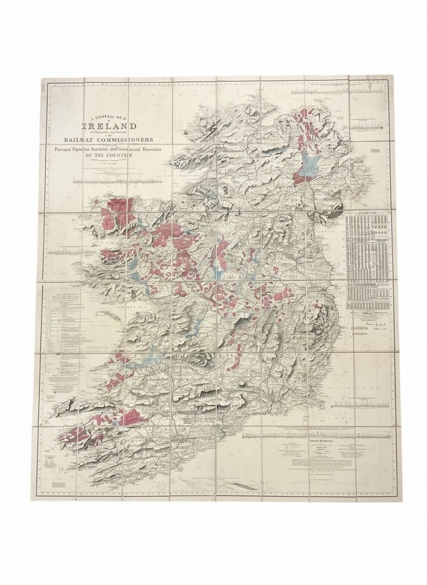 This c1855 map of Ireland is at Mullen’s auction of the Lord O’Neill collection of railwayana live and online auction on November 10. It was made by Richard Griffiths to accompany the report of the Railway Commissioners and shows the principal physical and geological structure of the country. Hand coloured and in a period leather slipcase the map is in fine condition and rare. The estimate is €1,000-€2,000. More than 730 lots will come under the hammer. UPDATE: THIS MADE 1,100 AT HAMMER