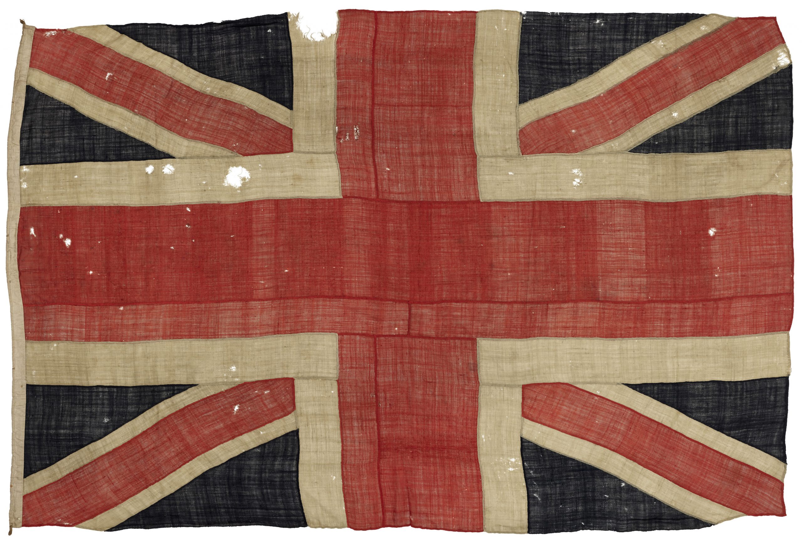 A Union Jack flag from the Battle of Trafalgar will come up at Christie’s Exceptional Sale in London on July 1 with an estimate of £500,000-800,000. One of the most spectacular and consequential naval victories in history, The Battle of Trafalgar ended the threat of an invasion of Britain by Napoleon, setting the scene for a century or more of British dominance of the seas. The flag shows signs of battle damage. Analysis by the Zaricor Flag Collection – from which it is being offered for sale – revealed shards of metal embedded in the fabric in several places, notably in the half-moon shaped loss to one edge, suggesting that this is the ‘footprint’ of a cannon ball. Fragments of wood splinters were also found throughout.
