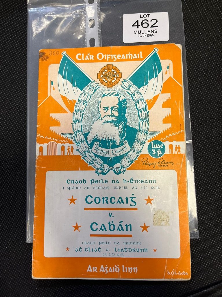 A 1945 All-Ireland senior football progamme is among the lots at The Collector’s Cabinet timed online auction by Mullen’s of Laurel Park, Bray, which runs until June 21. Outsiders Cork beat Cavan on a scoreline of 2-5 to 0-7. In this historic game the former Taoiseach Jack Lynch became a dual All-Ireland medallist. He had won four successive All-Ireland senior hurling medals between 1941 and 1944. The estimate for the programme is €400-€600.