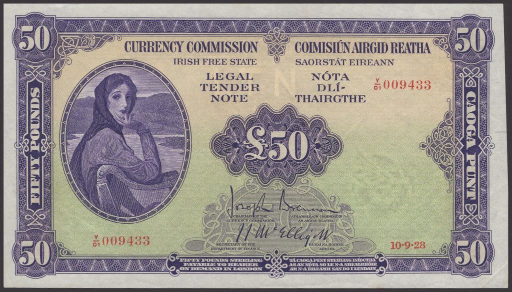 A rare early Irish £50 note dated September 10, 1928 and featuring Lady Lavery could make up to £15,000 (€17,600) at Noonans in Mayfair on June 25. That was the month when legal tender notes, pegged in value to the pound sterling, came into circulation. It followed a determination by the then Irish Free State in the mid 1920’s to design its own coins and banknotes. Until the advent of the euro three series of legal tender notes were issued by Ireland. The Irish Free State £50 note is considerably rarer than the £100 note. This particular one was described by Andrew Pattison of Noonan’s as: “one of the finest-known examples of this first date for the iconic Lady Lavery series”. A proof £100 note from 1978-79 featuring a vignette of 16th century pirate Grace O’Malley (Granuaile) is estimated at £2,000-£2,600 (€2,350-€3,052).