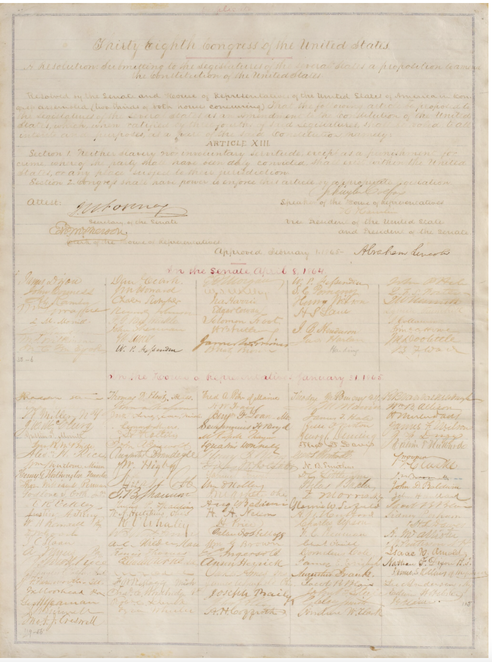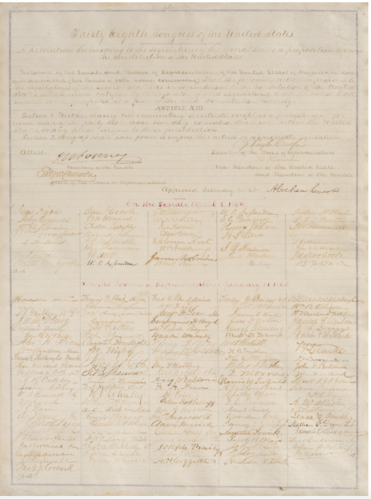 Manuscript copy of the Thirteenth Amendment, signed by Abraham Lincoln, abolishing slavery in the United States.